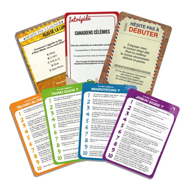 Nouvelles cartes spéciales « intrépide », plus d’interactions entre les équipes, durée de partie modulable… mais toujours le même principe : tu choisis une note entre 1 (facile) et 10 (expert) sur le sujet tiré. Plus la note est élevée, plus la question est difficile. Si tu réponds juste, tu avances d’autant de cases que ta note.