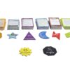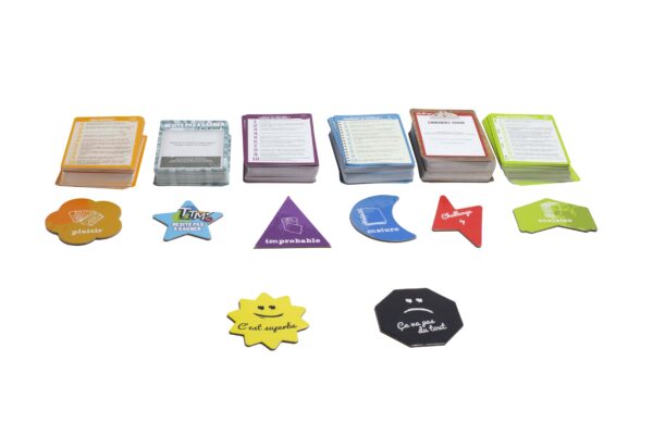 Les différentes catégories de questions sont représentées par des tuiles cartonnées de la même forme que celles du plateau,